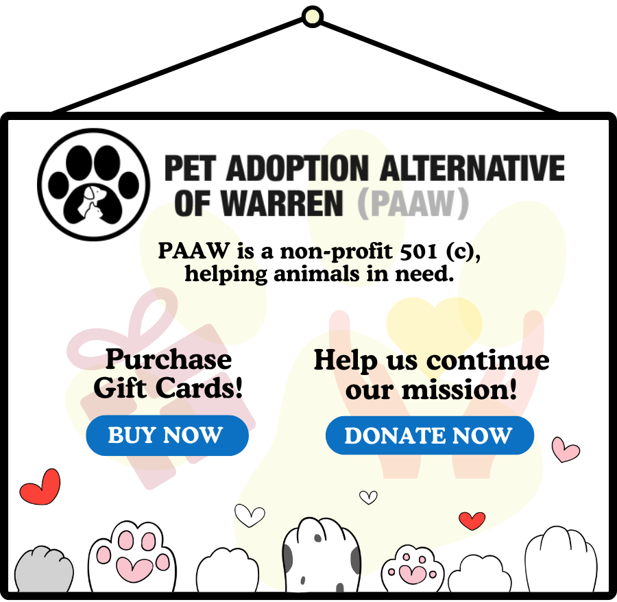 Pet Adoption Alternative of Warren (PAAWarren) is an independent, non-profit 501(C)(3), completely volunteer-run, foster-based animal rescue organization. These animals can’t make it without our help and we can’t do it without yours. Get Involved! Follow us on Social Media, share our posts of adoptable pets, volunteer, foster and please donate. Click here for other ways you can help.